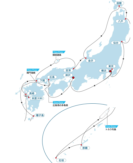 ※天候その他の事情により航路変更およびView Pointがご覧いただけない場合がございます。