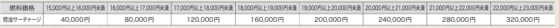 - 燃油価格の高騰に伴い、燃料費用の一部をお客様にご負担いただく場合がございます。燃油サーチャージの改定指標となる燃料価格は、2025年12月〜2026年1月の1バレルあたりの平均原油価格に同期間の米ドル為替レートの平均値を掛け合わせた価格を適用いたします。設定金額は下表の通りです。